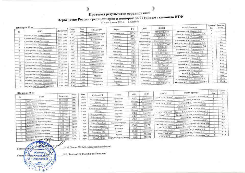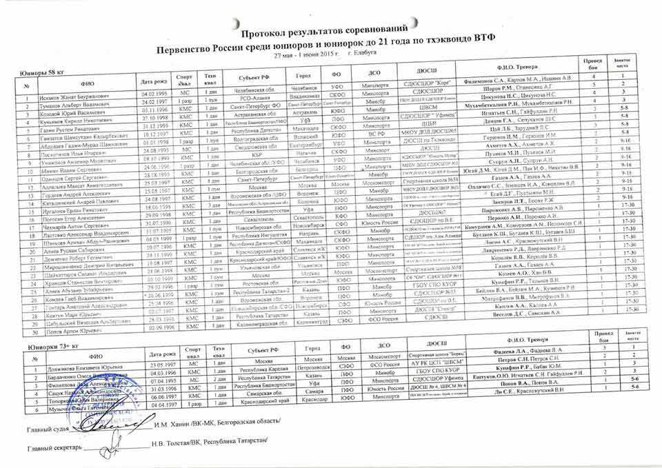 Итоговые протоколы Первенства России 28-31.05.2015 года, г.Елабуга, Республика Татарстан